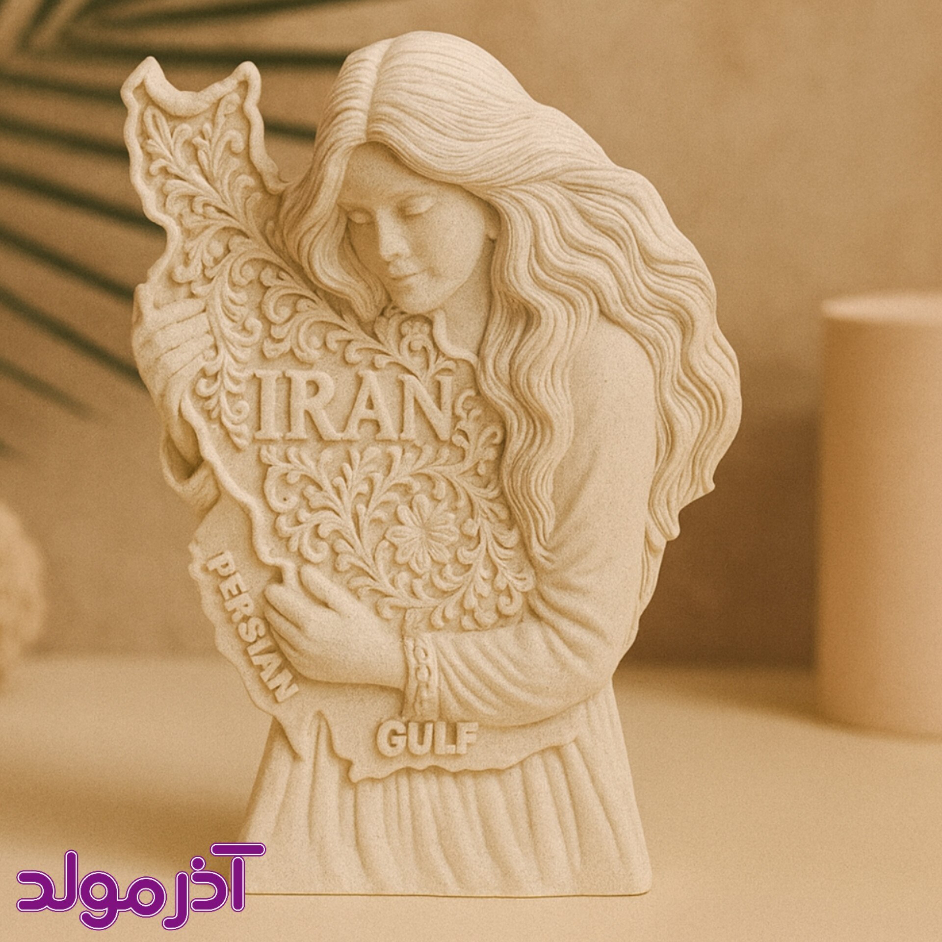 طراحی خاص و نمادین با طرح دختر آزاده در آغوش نقشه ایران